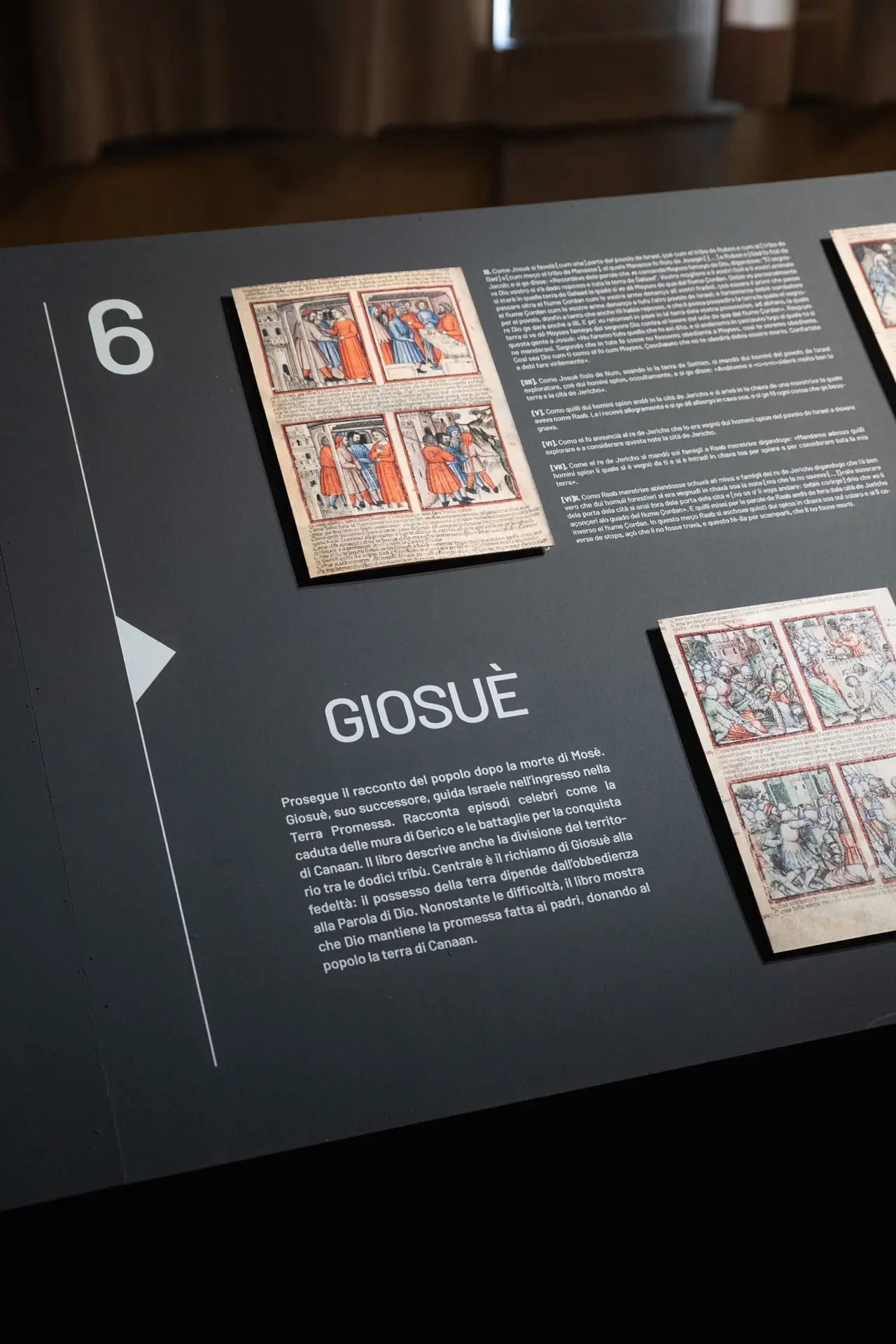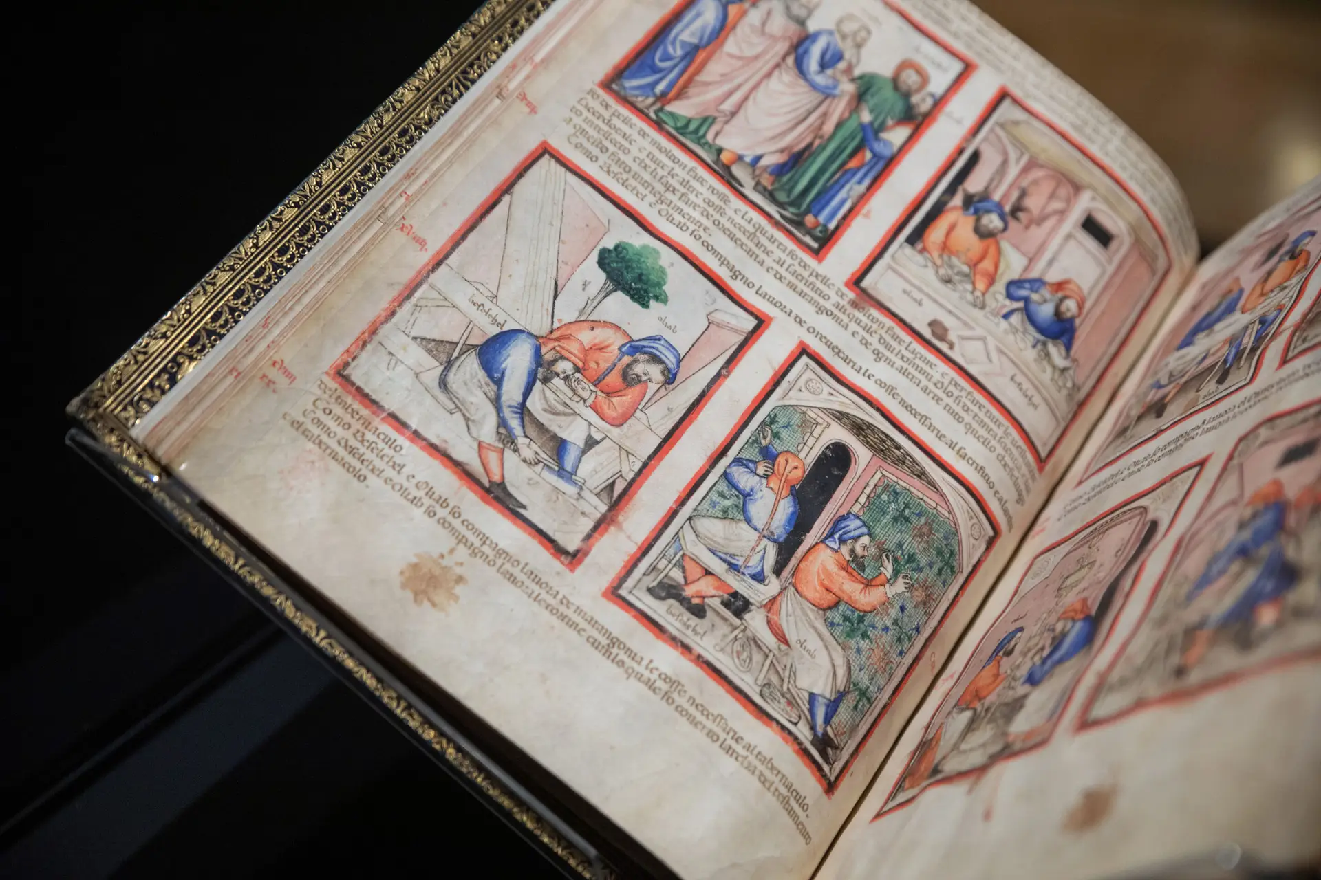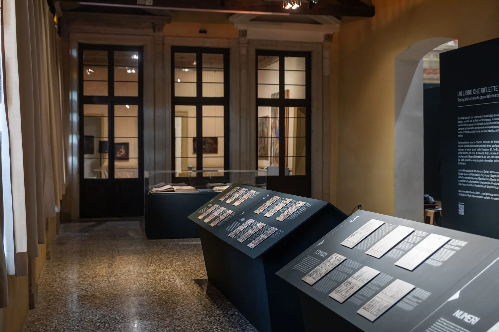 Tra le pareti dipinte del Salone, i visitatori possono ammirare i due codici originali in un allestimento che unisce contemplazione e tecnologia. Un video immersivo introduce nel cuore delle immagini, mentre una postazione digitale interattiva consente di sfogliare virtualmente l’intero manoscritto: 873 miniature che raccontano la Bibbia e la Padova del Trecento in un’unica, straordinaria visione.